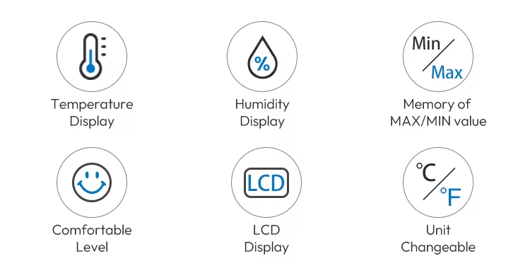 3.Memorized MAX/MIN values of indoor temperature and humidity display in the same time | |